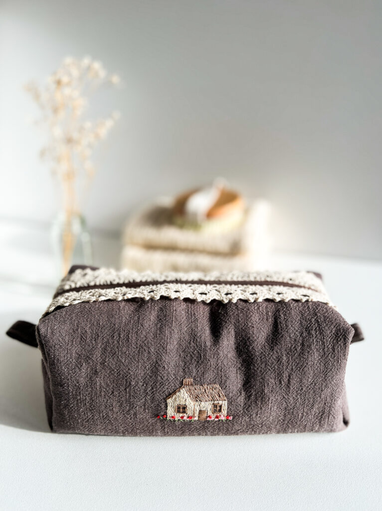 Lniana kosmetyczka z ręcznie haftowanym pieskiem i koronką