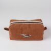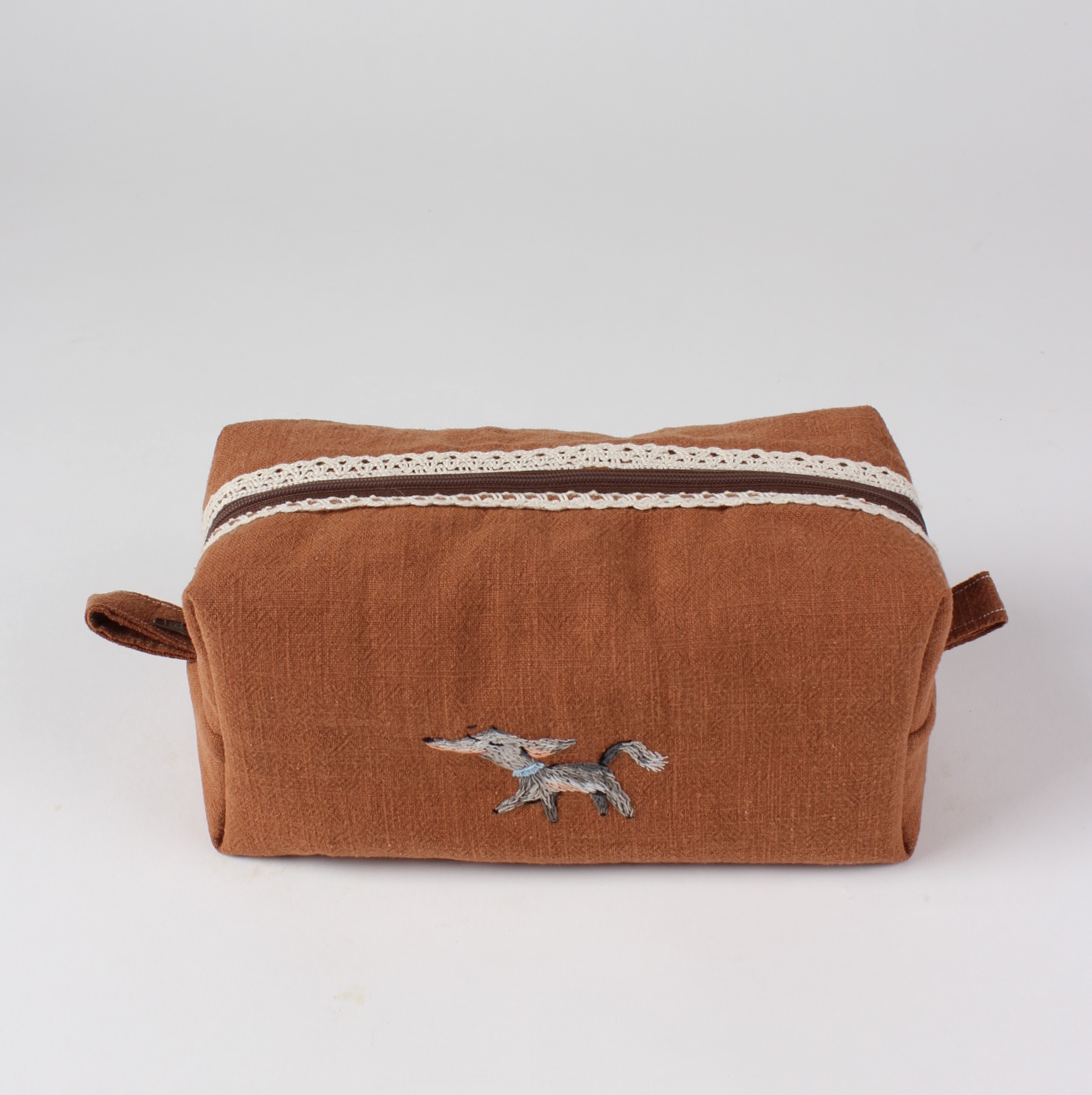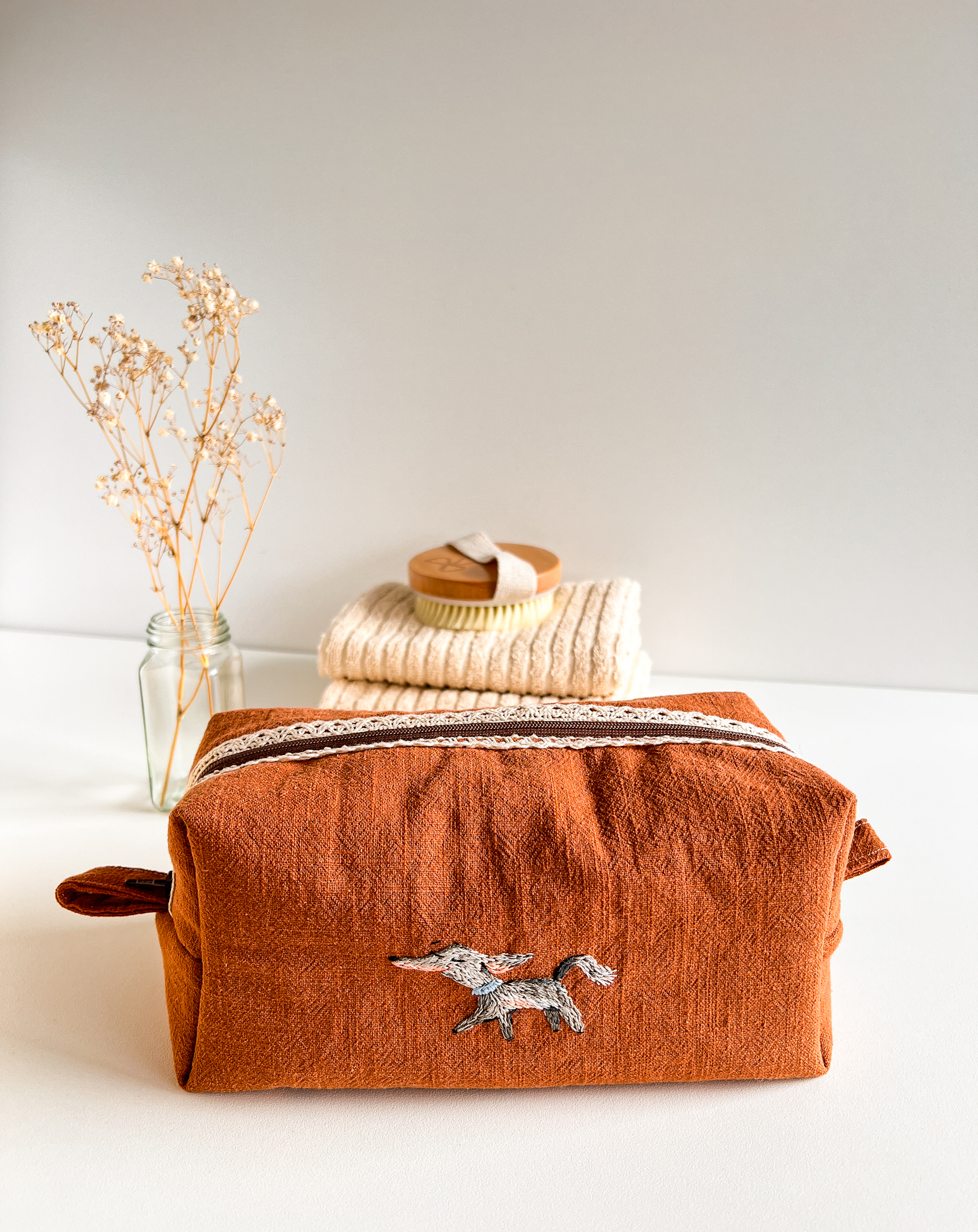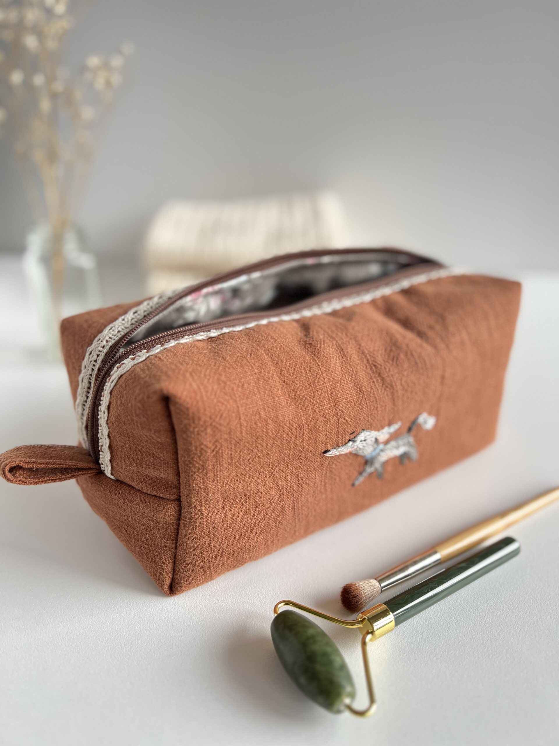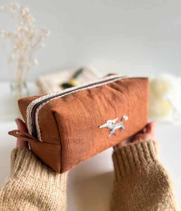 Elegancka, subtelna i wyjątkowa kosmetyczka uszyta z brązowego lnu. Naturalna tkanina w połączeniu z ręcznym haftem pieska nadaje jej niepowtarzalnego, rzemieślniczego charakteru.