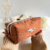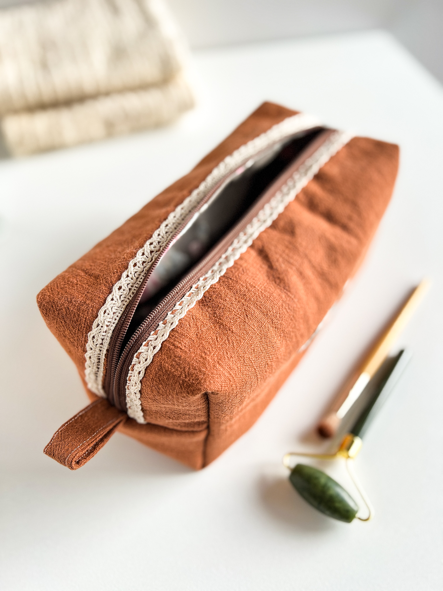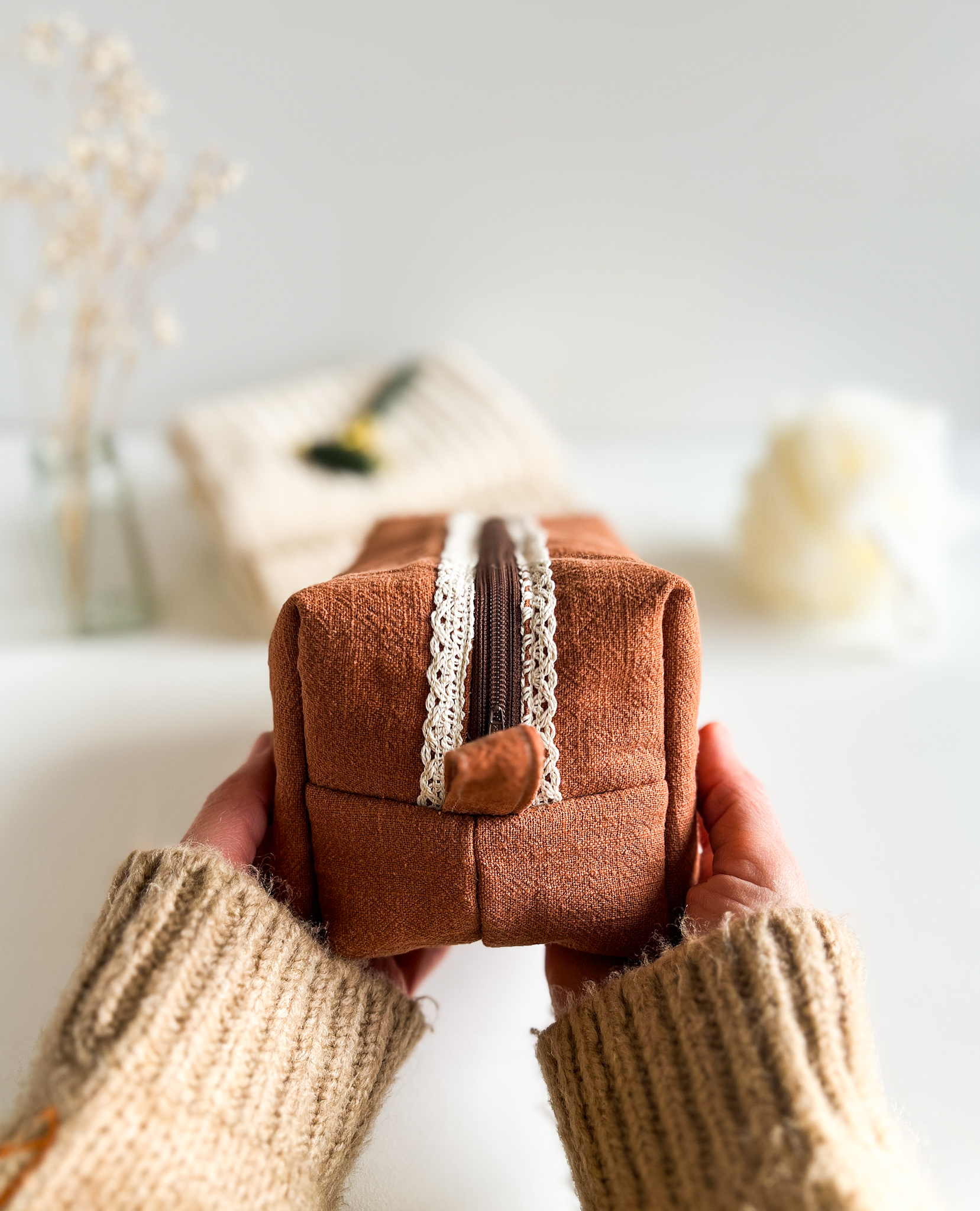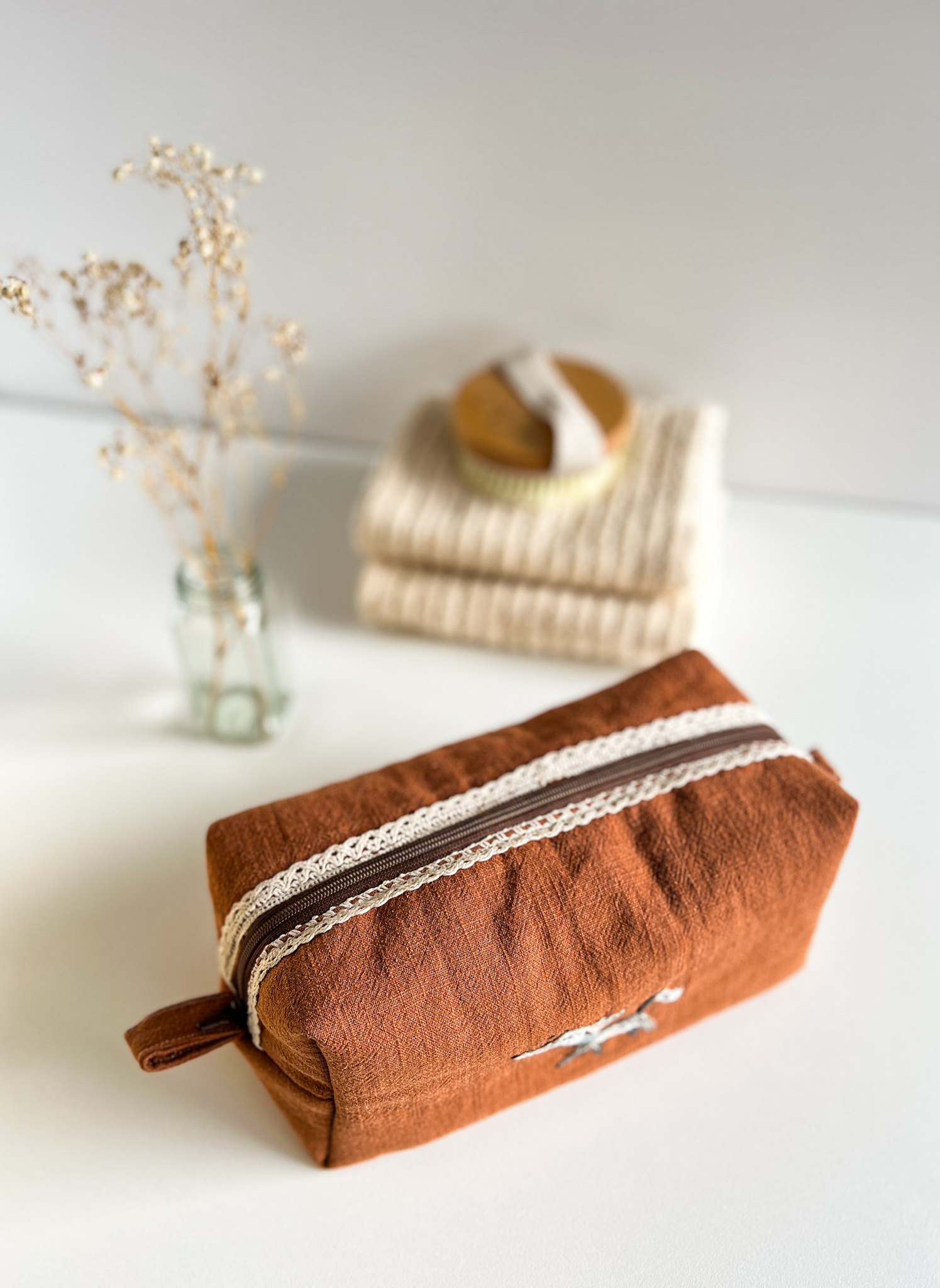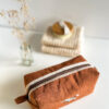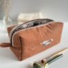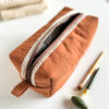 Elegancka, subtelna i wyjątkowa kosmetyczka uszyta z brązowego lnu.