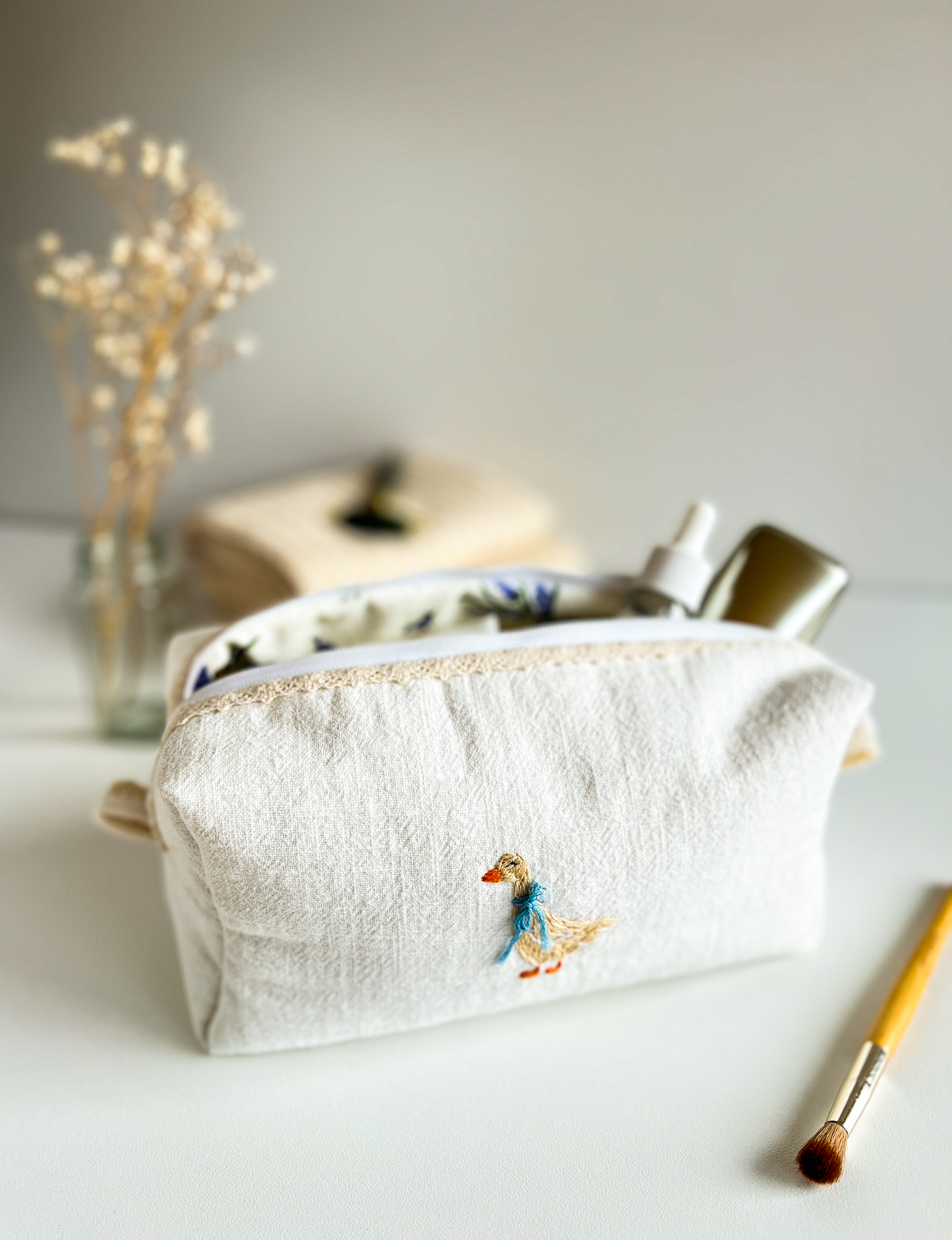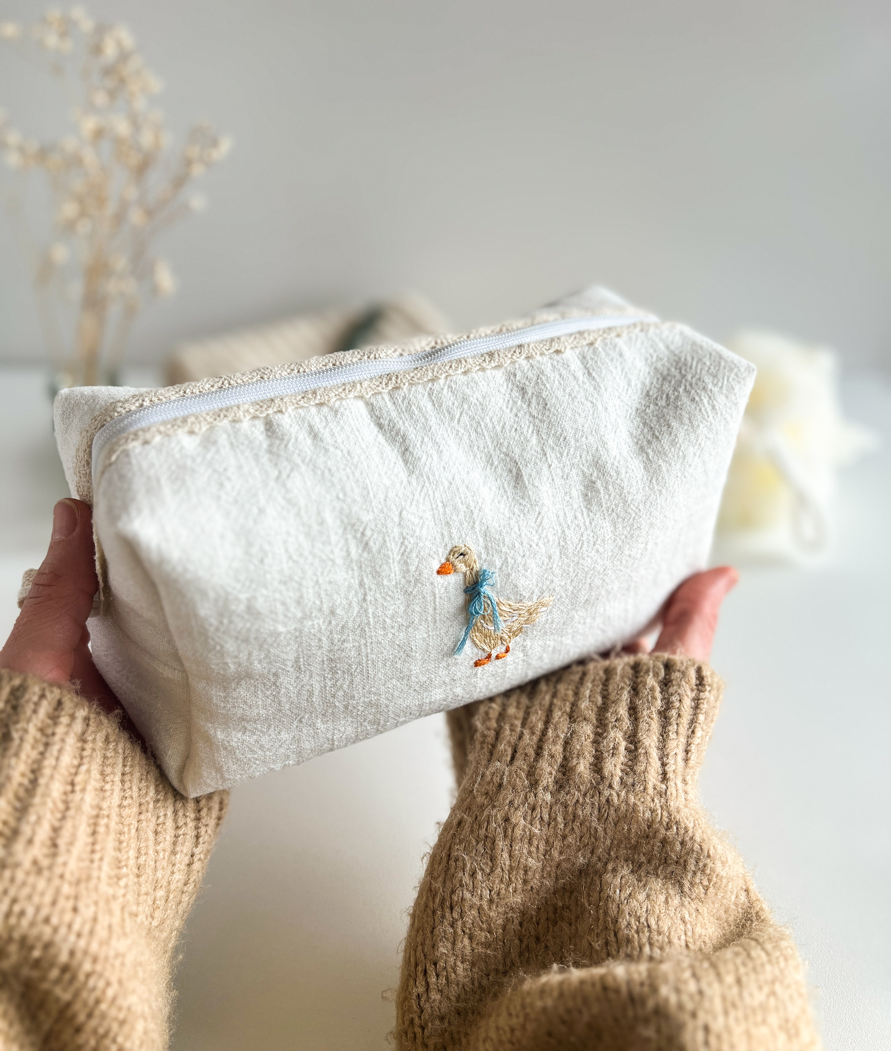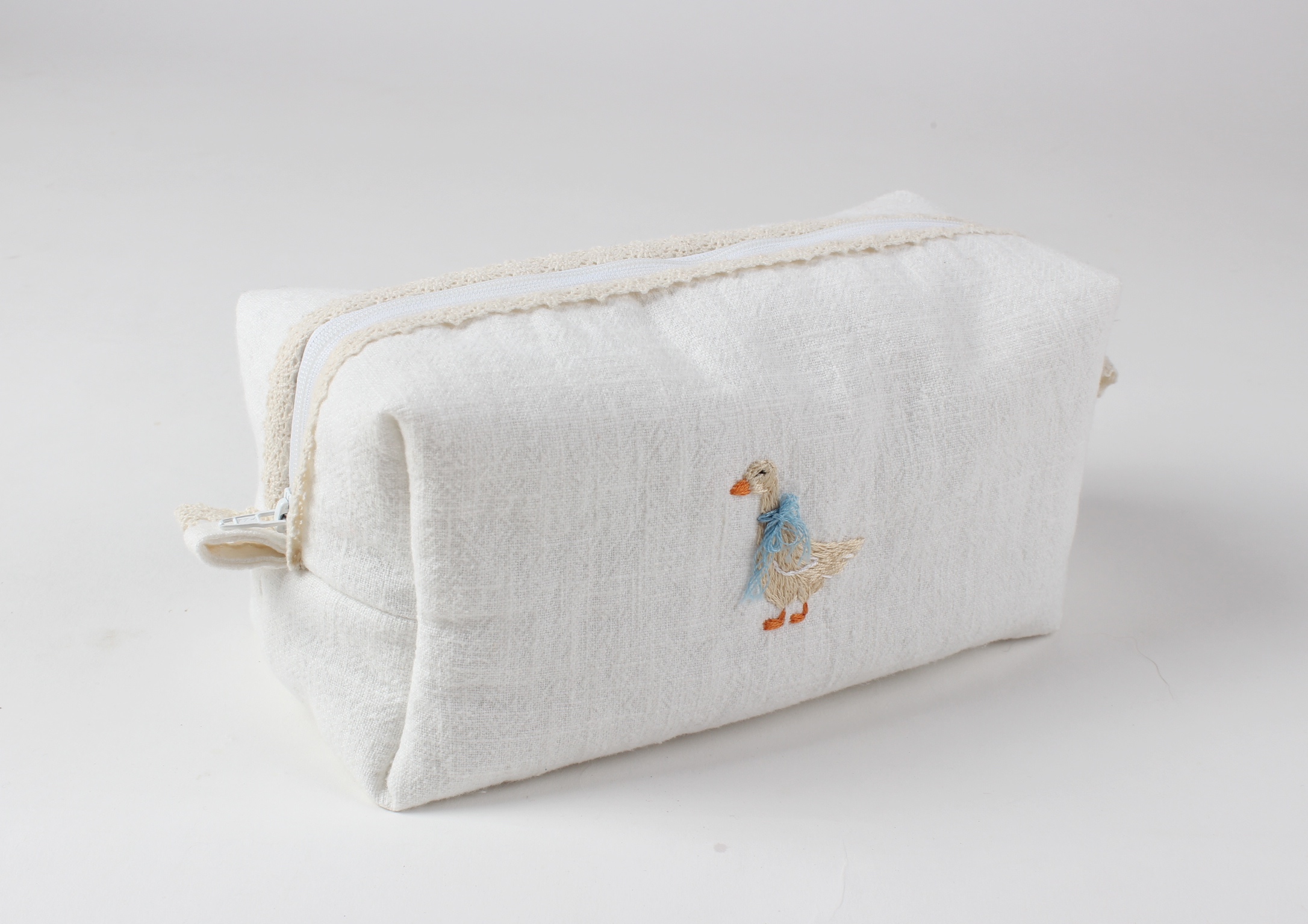 Elegancka, subtelna i wyjątkowa kosmetyczka uszyta z białego lnu. Naturalna tkanina w połączeniu z ręcznym haftem w motyw gąski nadaje jej niepowtarzalnego, rzemieślniczego charakteru.