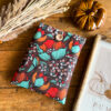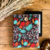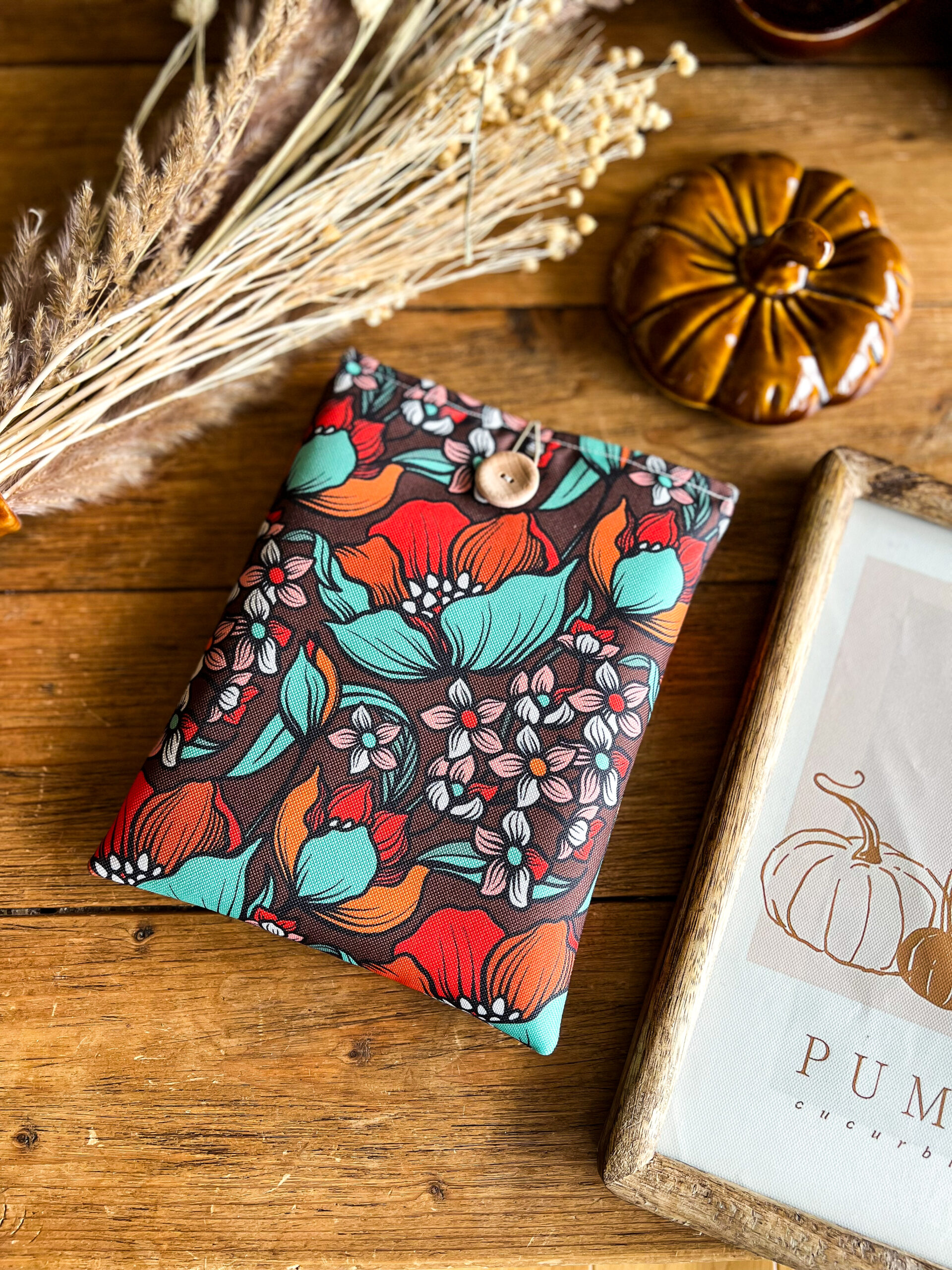 Ręcznie szyty pokrowiec na książkę z wodoodpornego materiału, wyściełany miękką podszewką i zapinany na guzik z gumką.