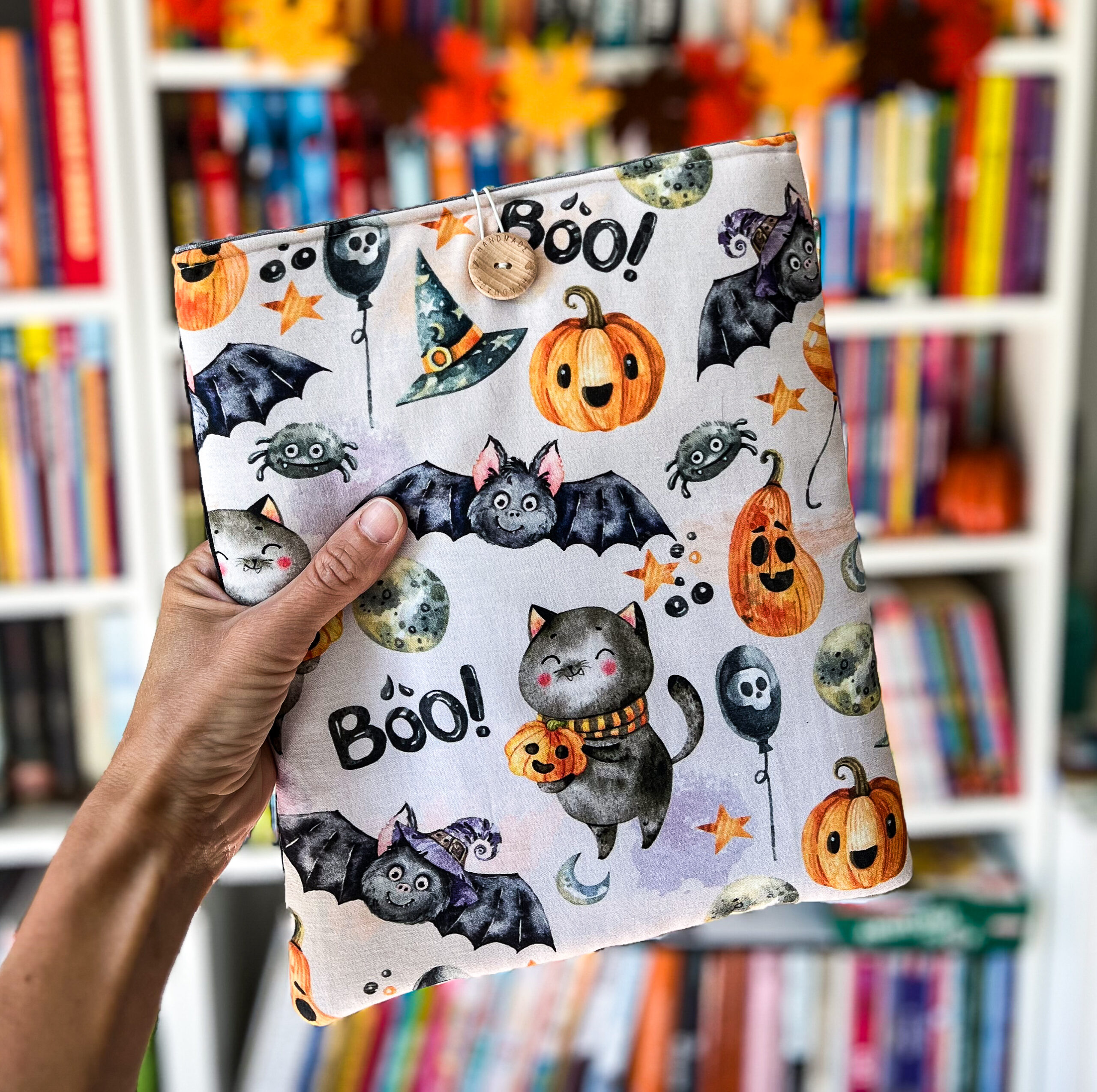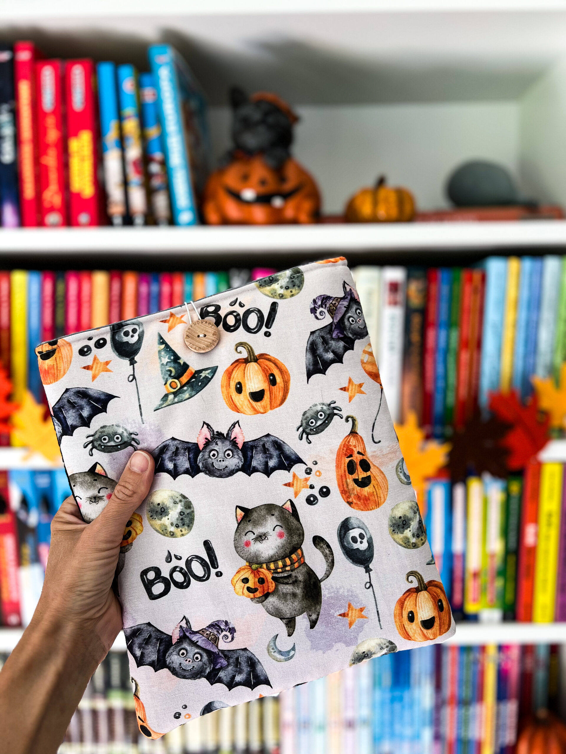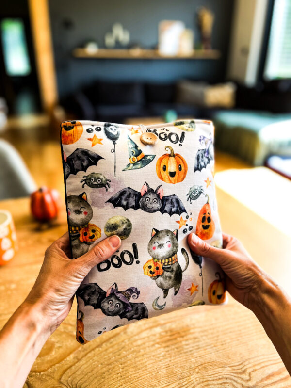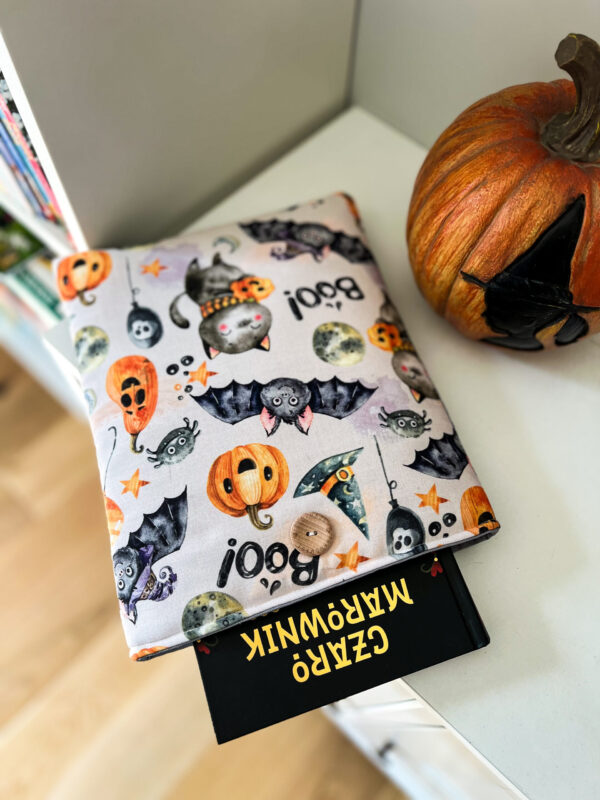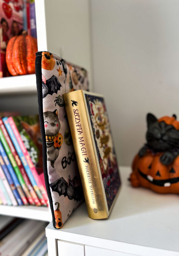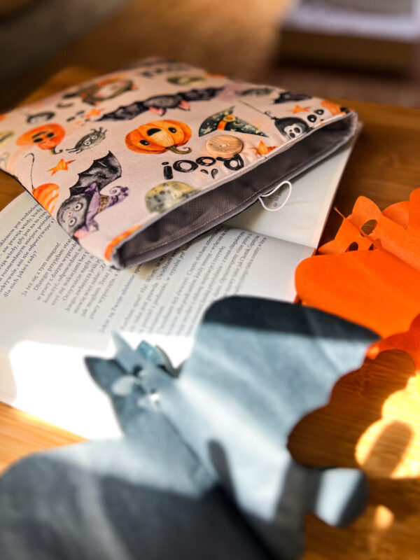 Zapinany na guzik z elastyczną gumką, świetnie trzyma zawartość w środku. Wzór z motywem Halloween – dynie, koty i nietoperze – wprowadza wyjątkowy klimat jesiennych wieczorów z książką. To także świetny pomysł na prezent dla moli książkowych i fanów jesiennej magii.