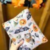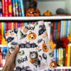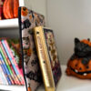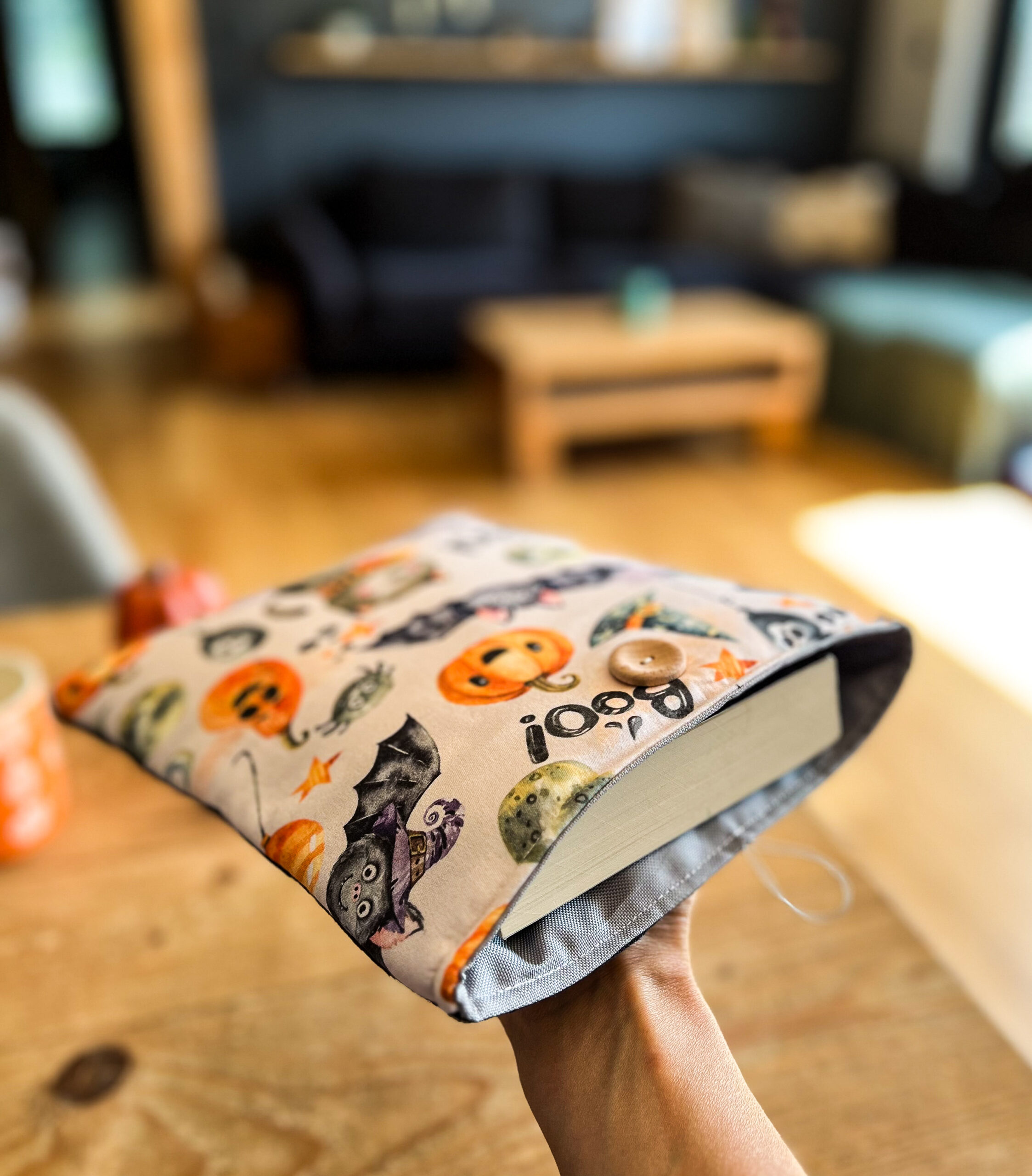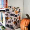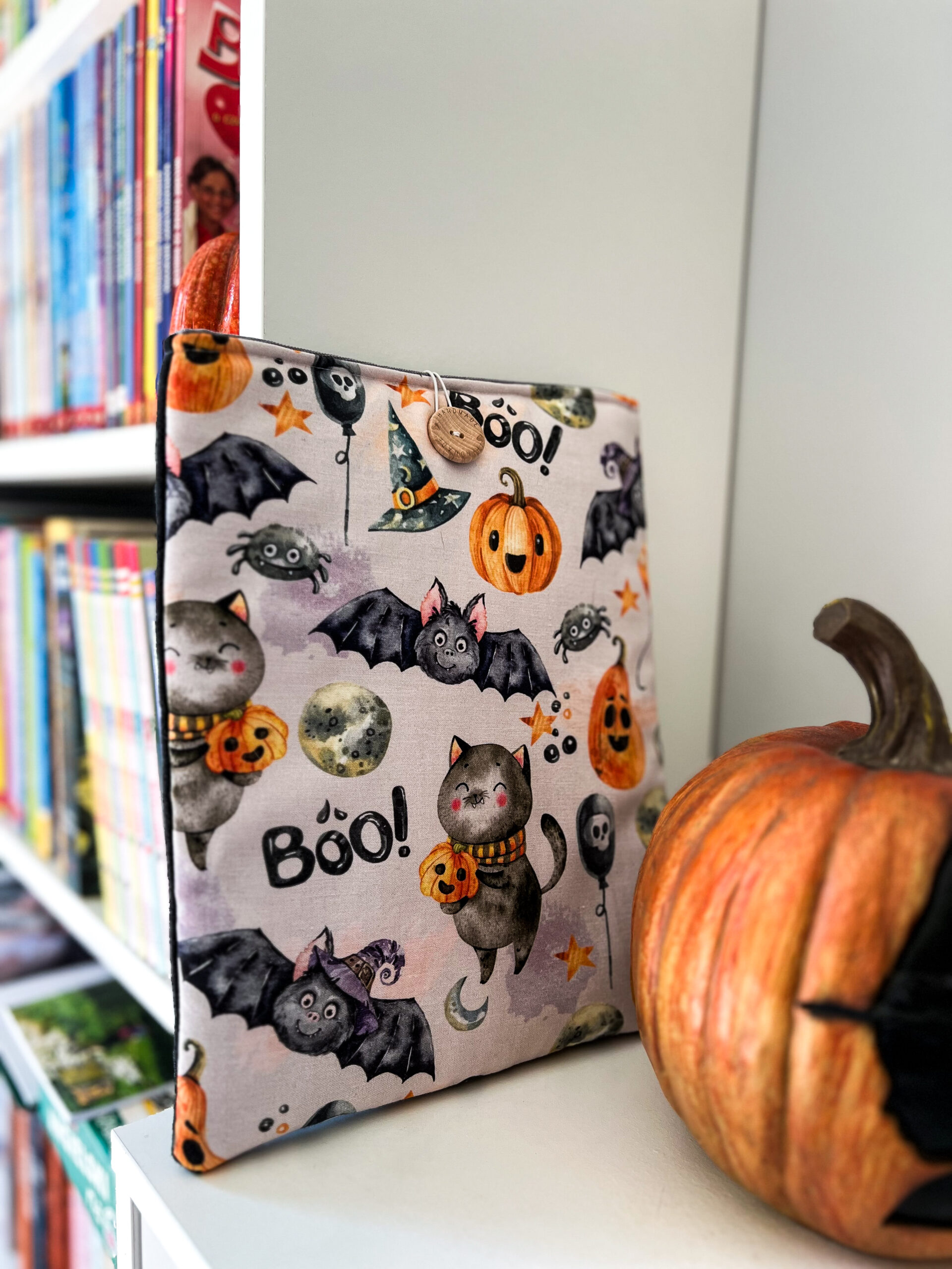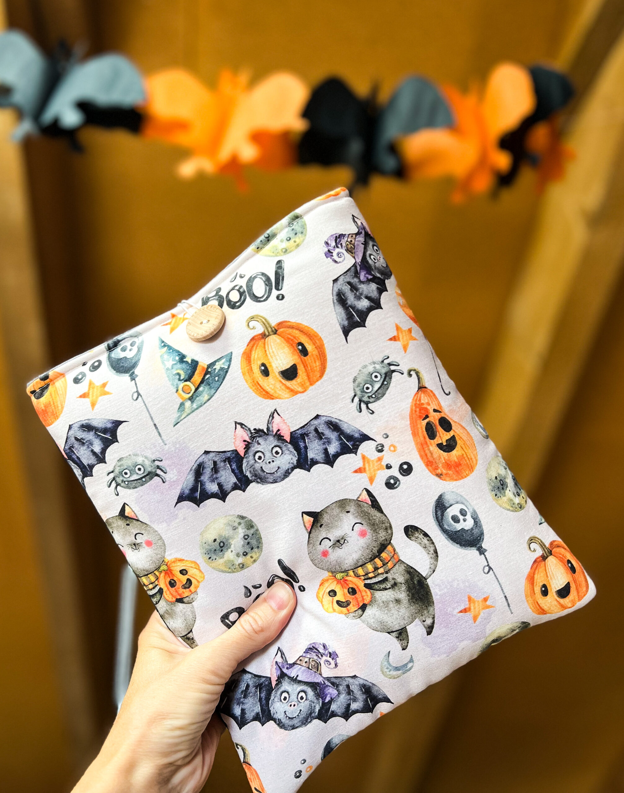Zapinany na guzik z elastyczną gumką, świetnie trzyma zawartość w środku. Wzór z motywem Halloween – dynie, koty i nietoperze – wprowadza wyjątkowy klimat jesiennych wieczorów z książką. To także świetny pomysł na prezent dla moli książkowych i fanów jesiennej magii.