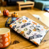 Ręcznie szyty pokrowiec na książkę z wodoodpornego materiału, wyściełany miękką podszewką i zapinany na guzik z gumką.